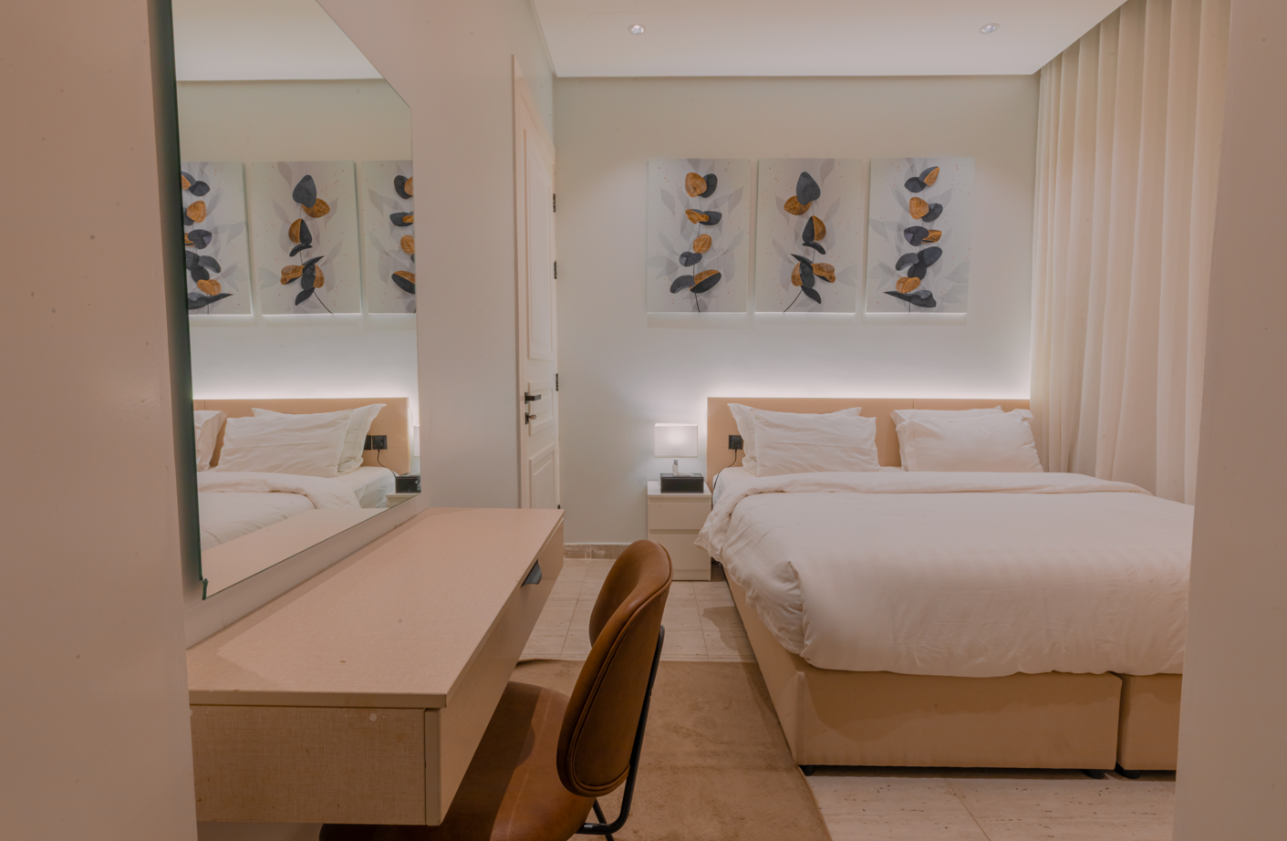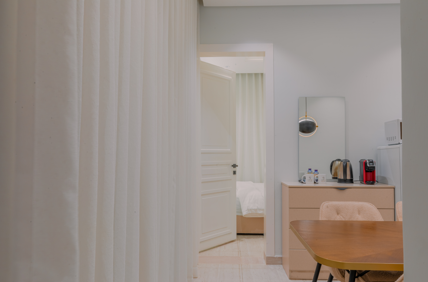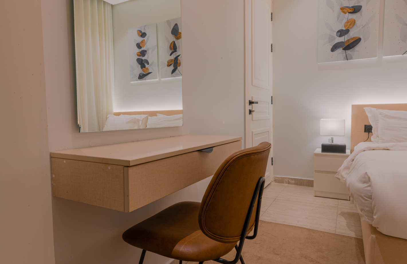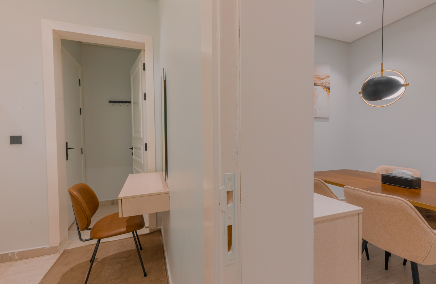 A stylish one-bedroom apartment in Al Malqa featuring a spacious hall, modern finishes, and a warm, inviting ambiance perfectly suited for comfortable living, short stays, and professionals seeking a premium lifestyle.