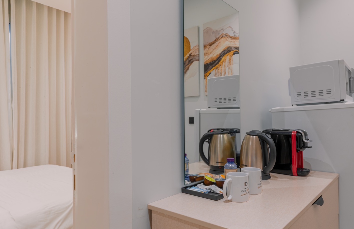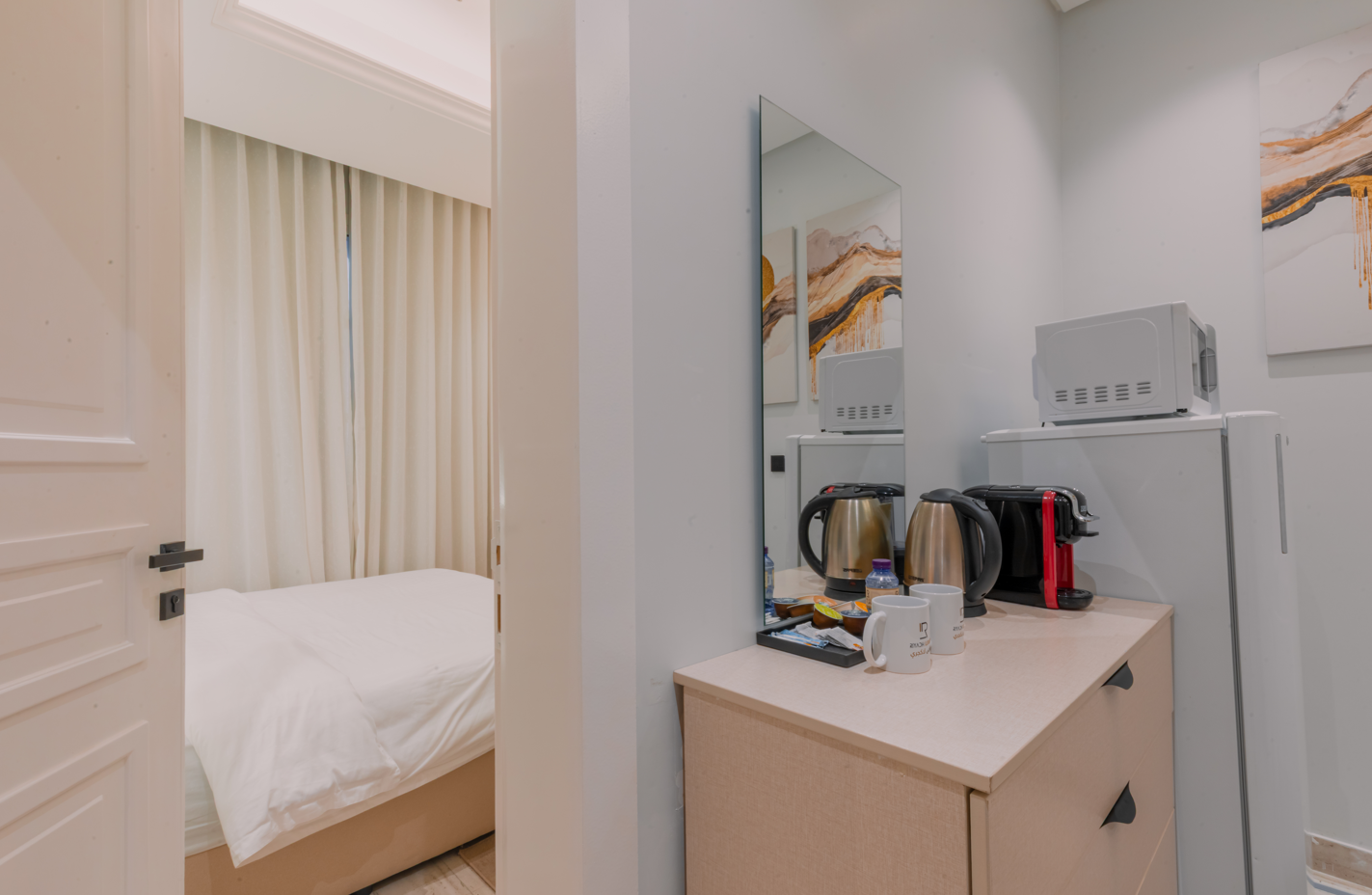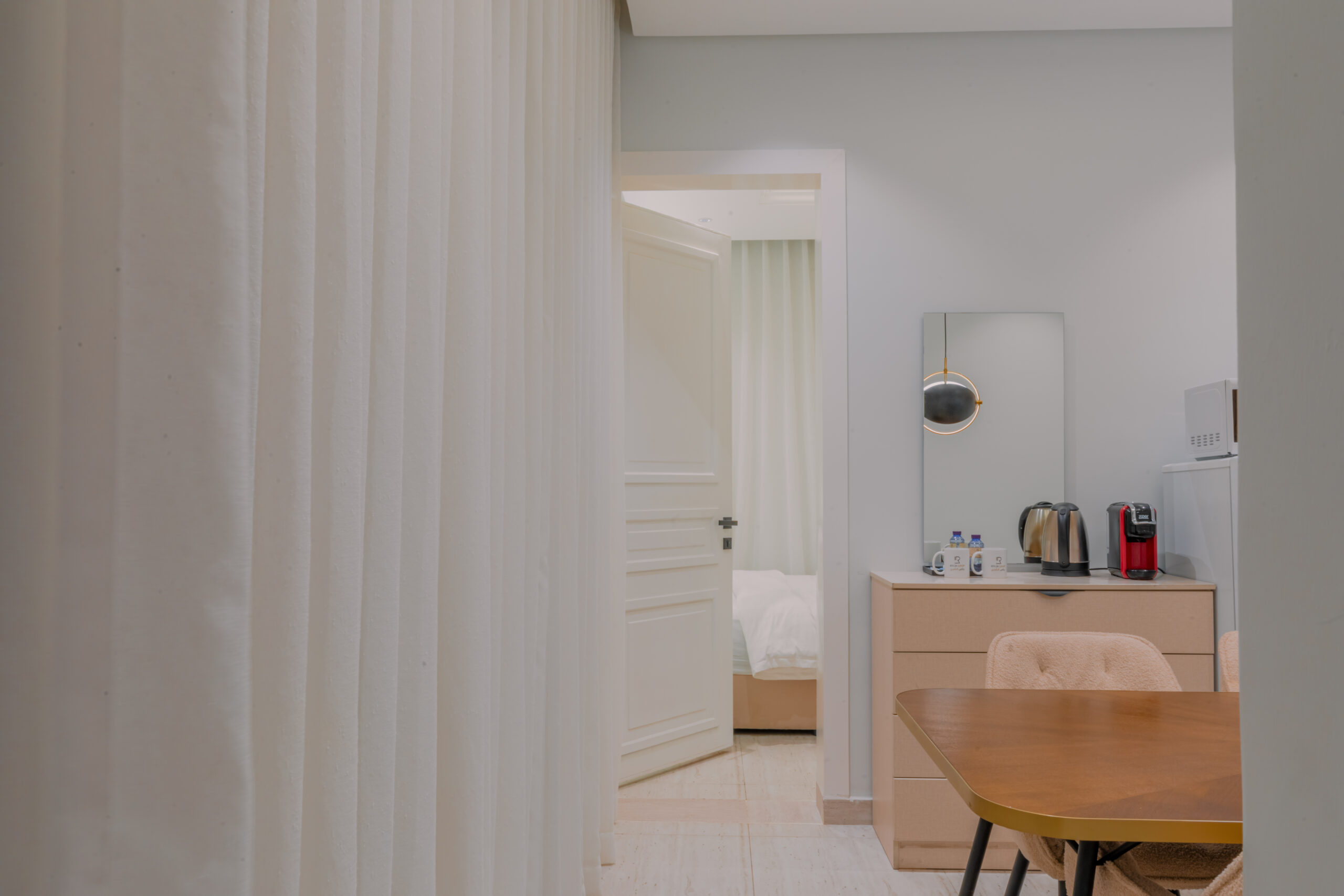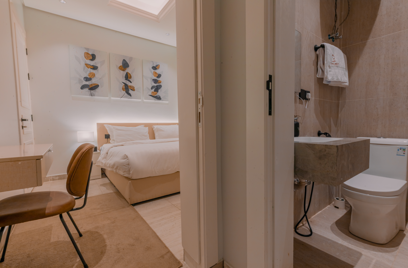 A stylish one-bedroom apartment in Al Malqa featuring a spacious hall, modern finishes, and a warm, inviting ambiance perfectly suited for comfortable living, short stays, and professionals seeking a premium lifestyle.
