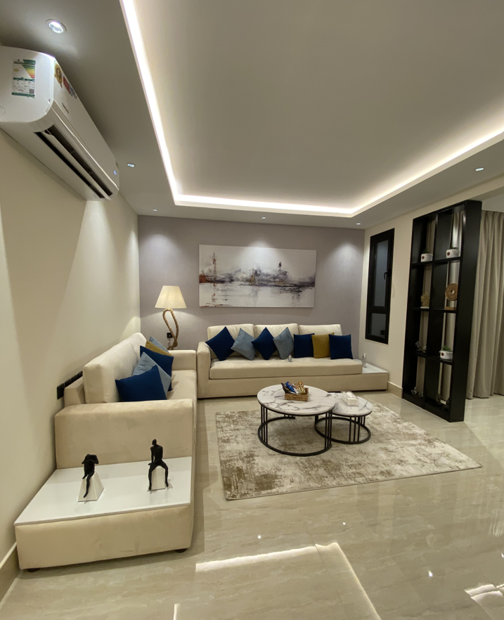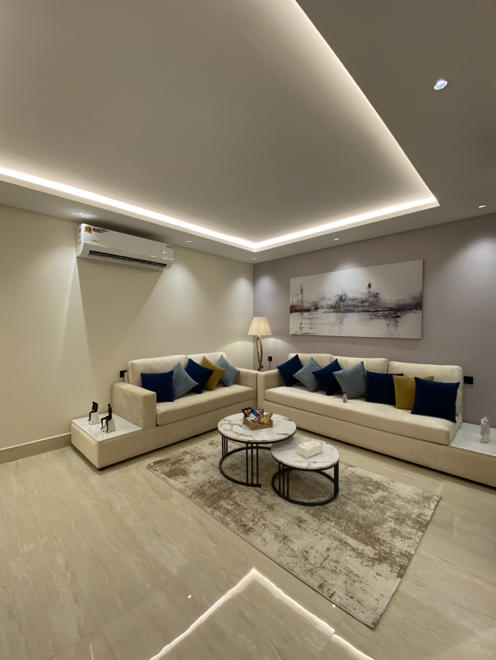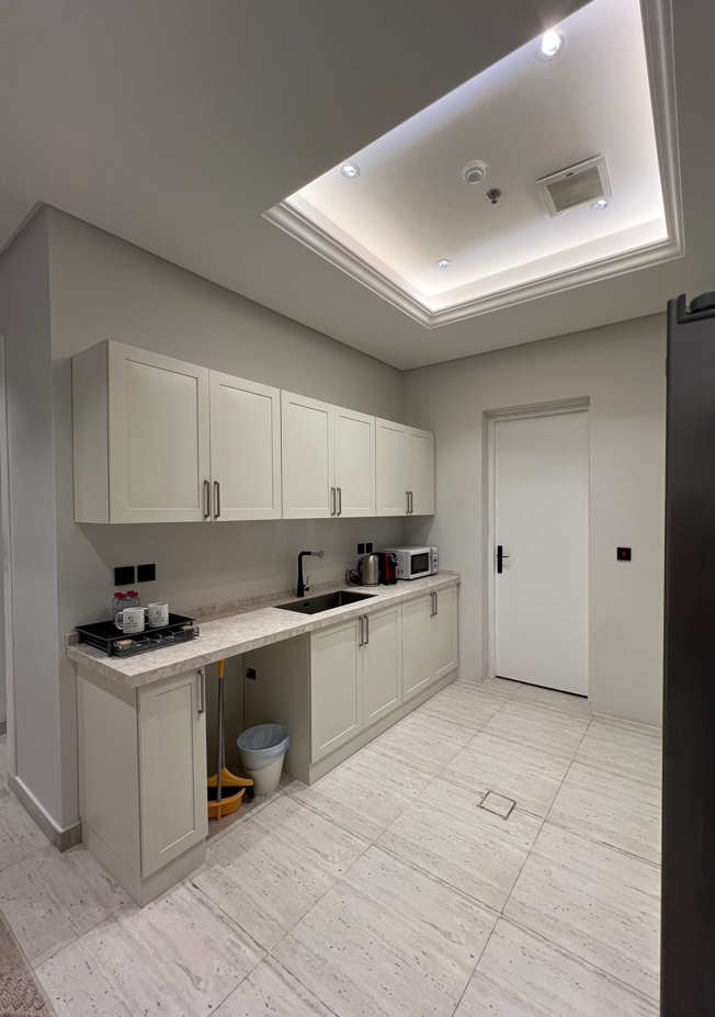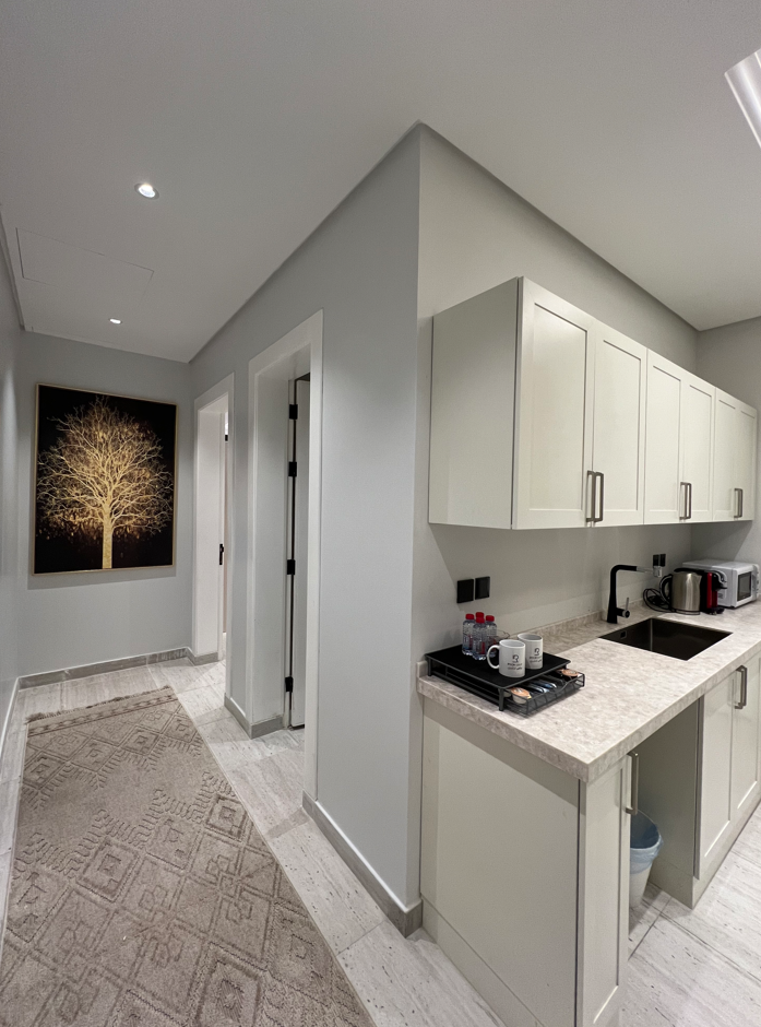 A contemporary one-bedroom apartment in Al Malqa with a fully equipped kitchen, designed for effortless living offering a perfect mix of comfort, functionality, and modern elegance for short stays or daily living.