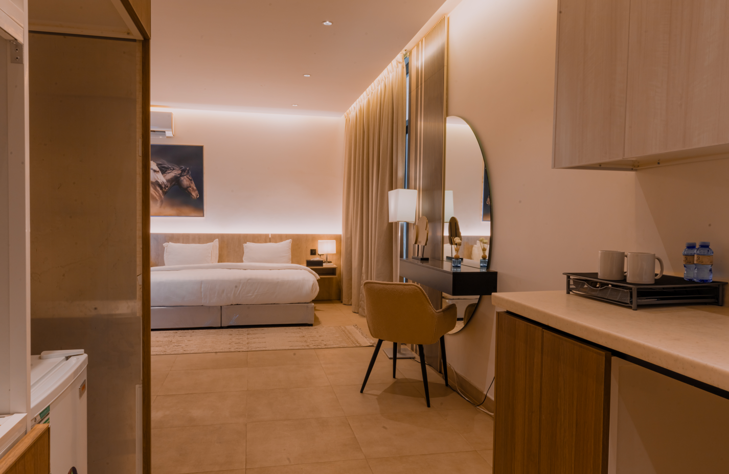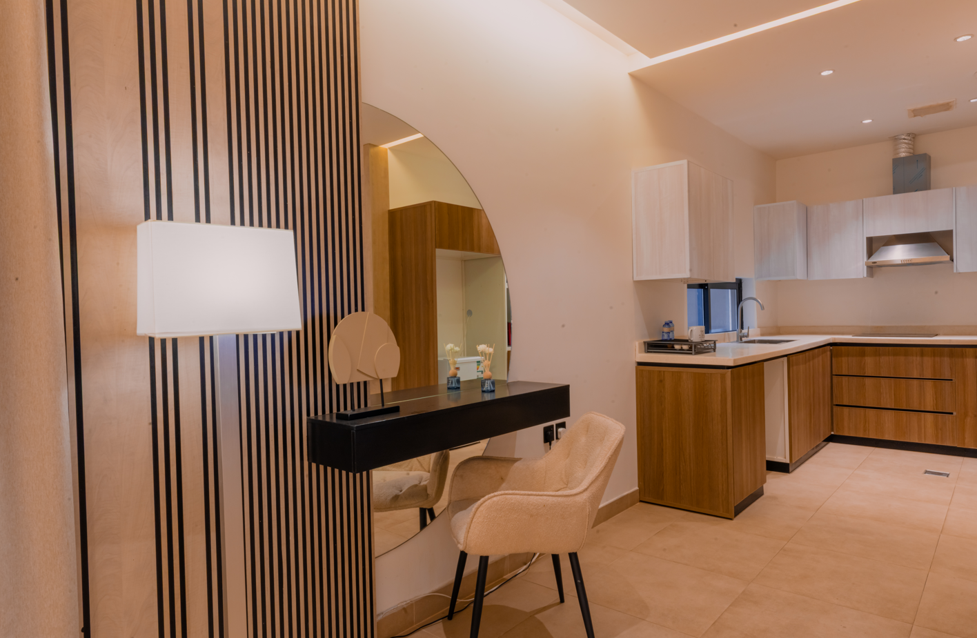 A contemporary studio apartment in Al Qirawan designed for modern living, offering a perfect blend of style, comfort, and functionality ideal for short stays, professionals, and city-based living.